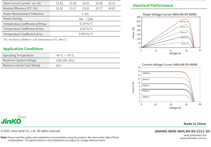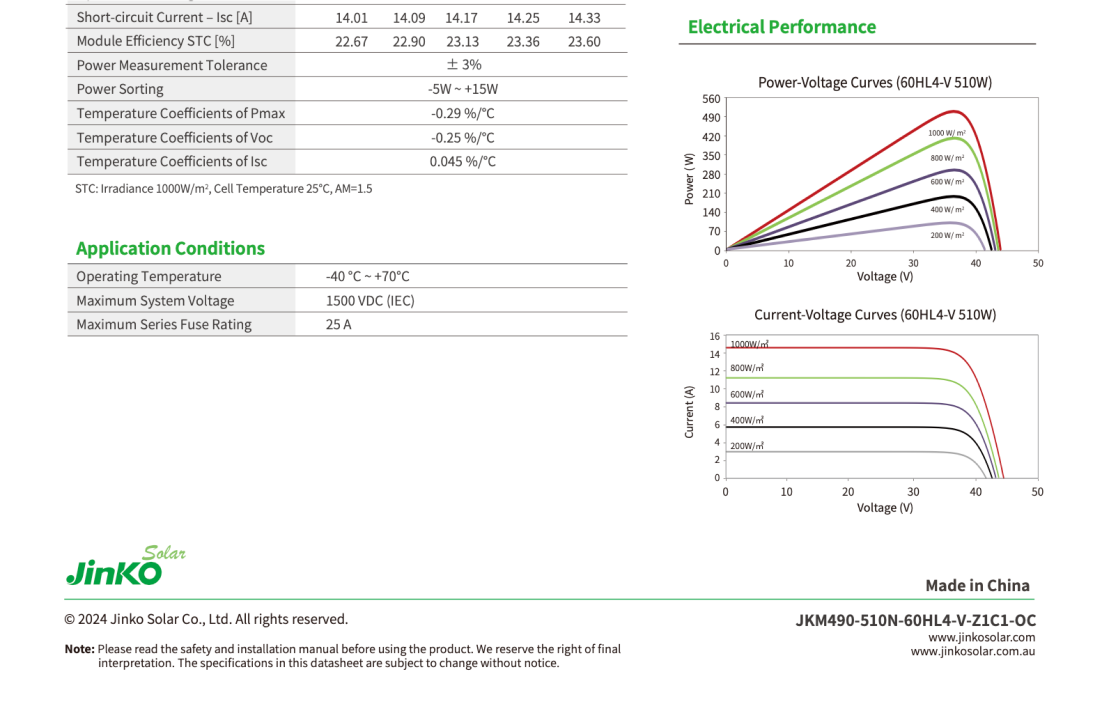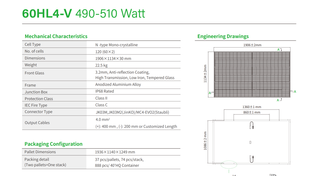 490-510 wattThe Jinko 60HL4-V is a high-output, mono-facial N-type solar panel in the 490–510W range—ideal for homeowners who want strong generation from a standard rooftop layout. N-type cell technology helps maintain performance over time, while the higher wattage can reduce the number of panels needed for the same system size (roof space dependent).
